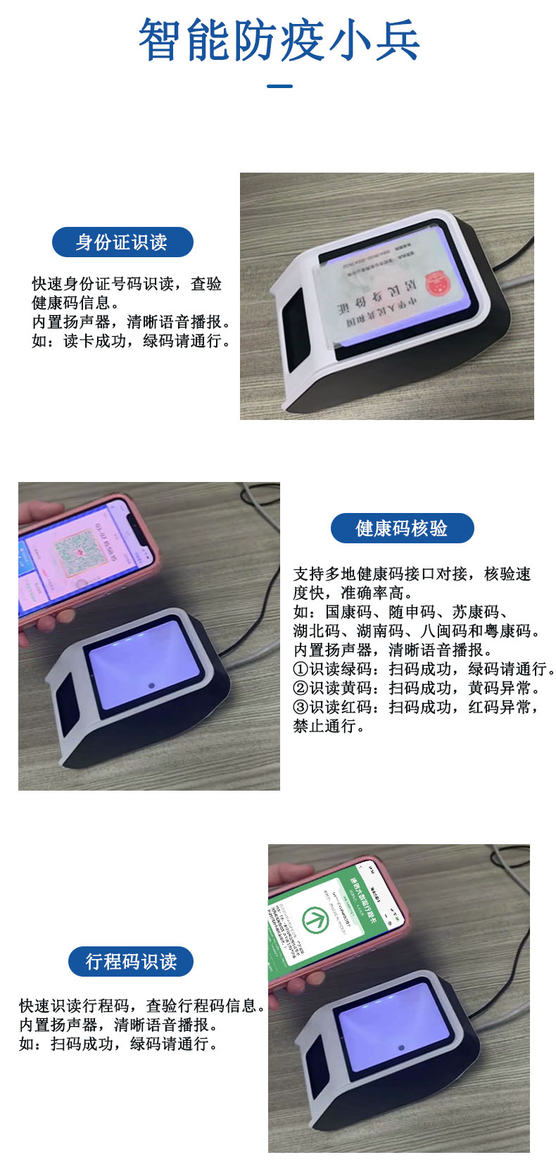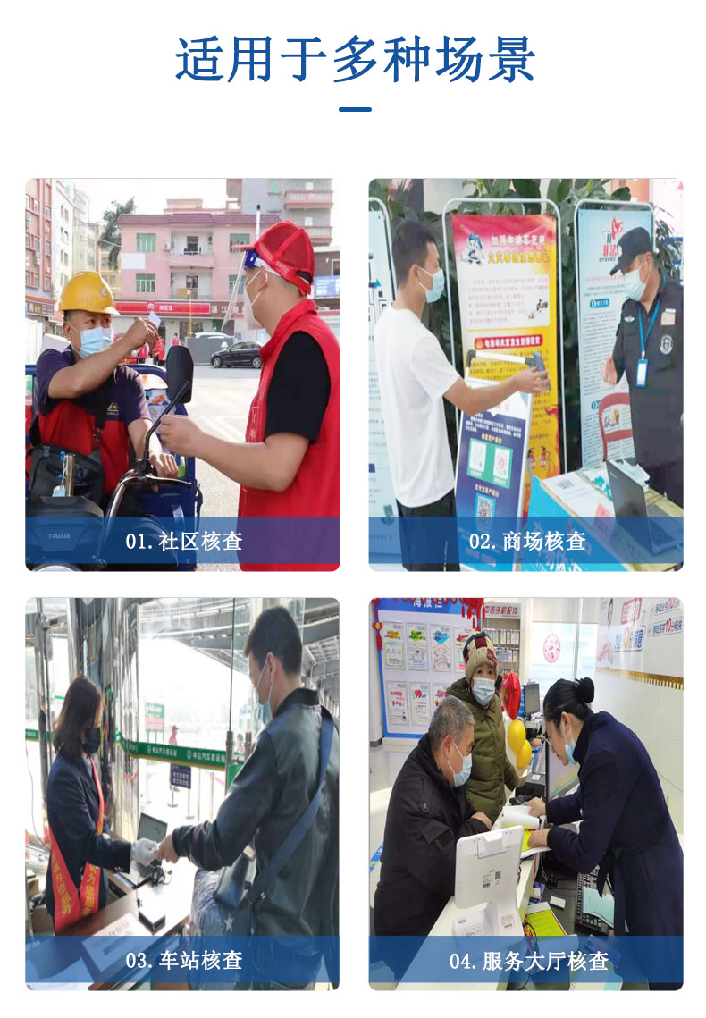 结合目前的防疫需要,在办公大厦、大型商超、地铁站、火车站等人流密集的地点进行“手机健康码+身份证核验”检测,可以提高过检效率,也大大减少了聚集在一起引起的交叉感染,避免过多的人员接触和聚集,从而实现高效率的人员流动管理,并达到防御疾控要求的精准防控目的。